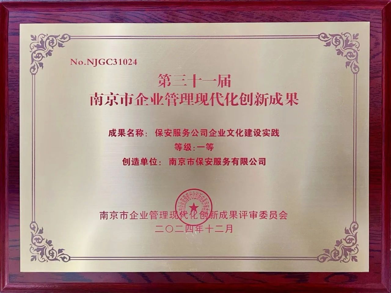 在12月19日召開的南京市企業聯合會、南京市企業家協會七屆四次理事會暨2024“兩會”年會上,南京市保安服務有限公司憑借其卓越的管理創新成果——《保安服務公司企業文化建設實踐》,榮獲第31屆南京市企業管理現代化創新成果一等獎。